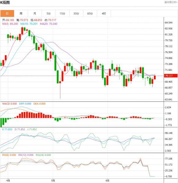 原油价格早盘以来呈现横盘走势,只要价格位于68.75上方,今日看多观点仍将成立,上方有50指数支撑,等待上探70.00、71.55为主站。今天的预期交易区间在69.32 支撑位和 70.74阻力位之间。今日预期趋势:看涨