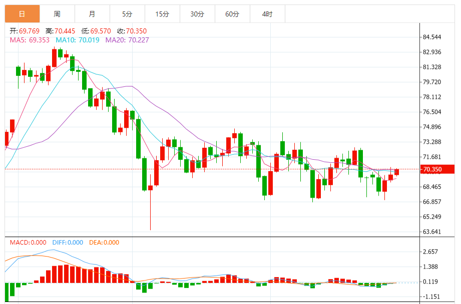 小时图上看,NYMEX原油短线有望重新挑战70.55美元,站上后或进一步上摸71.63美元,它们分别是72.71美元-67.04美元下跌区间的61.8%斐波那契回档位和80.9%斐波那契回档位。