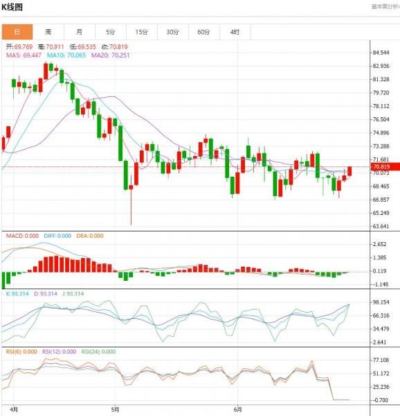 昨日,原油整体走势震荡慢涨。目前,KDJ呈金叉趋势,油价在获得下轨支撑后已反弹至布林线中轨附近,如果能在布林线中轨70.34附近突破阻力,预计将进一步向布林线上轨73.50移动,对于较强的阻力,请参考5月24日的高点74.71附近位置,需要顶破该位置,才能打开中线看涨信号。因现在油价受到布林线中轨的压制,下方留意5日均线69.24附近支撑,假使回落至这个位置下方,将削弱短线看涨信号。