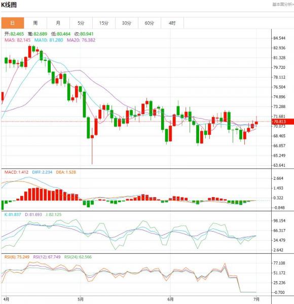 上个星期,原油整体走势触底反弹,短期看涨信号增多,初始阻力在55日均线72.04附近,6月21日高点72.69附近,100日均线73.83附近。在最近的波动范围内,阻力在5月24日高点的74.71左右,如果这种阻力能够顶破,将有望打破近两个月的宽幅震荡走势。