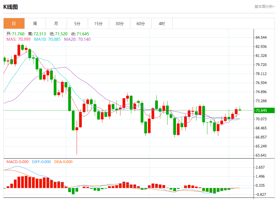 周四盘中,WTI原油报71.283,跌幅0.74%。