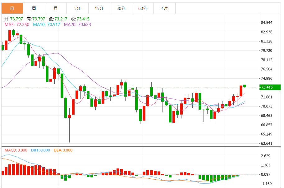 日线级别:震荡上涨;MACD金叉且初步上穿零轴,KDJ金叉,10日均线上穿21日均线结成金叉,5日均线上穿55日均线结成金叉,布林线轻微开口,油价有望沿布林线上轨向上运行,若能顶破5月24日高点74.71附近阻力,则意味着突破近两个月的宽幅震荡区间,增加后市中线看涨信号;进一步阻力参考4月28日高点76.91附近阻力,4月24日高点阻力在79.15附近阻力。