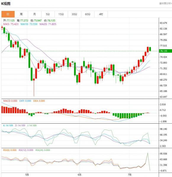 油价目前面临200日均线阻力,KDJ已发出短期超买信号,短线油价存在一定回调风险。因MACD金叉良好,短期均线多头排列,5日均线穿过100日均线,21日均线穿过55日均线,如果支撑位能够维持在74.71附近,未来市场仍将倾向于看涨仓位,但有必要对回调弱于预期的可能性保持谨慎。