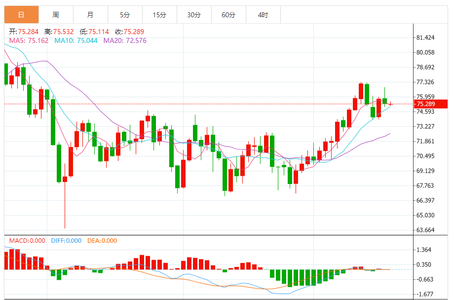 由于MACD金叉信号仍在,油价仍略高于5-6月的震荡区间,若能强势顶破200日均线阻力,目前该阻力在76.81附近,则有望打开新的上涨通道,油价中线有望重新涨向4月份高点83.51附近;短线的话,上周高点阻力在77.31附近,4月26日高点阻力在77.90附近,4月24日高点阻力在79.15附近。