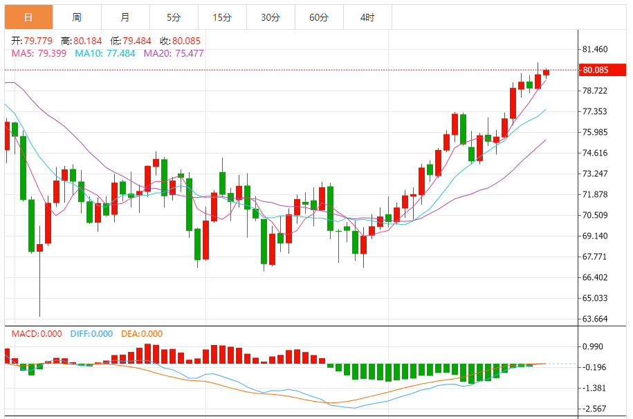 下方5日均线支撑目前在79.39附近,周二低点支撑在78.27附近,10日均线支撑在77.46附近,100日均线支撑目前在76.58附近,若意外回落至该位置下方,则削弱后市看涨信号。