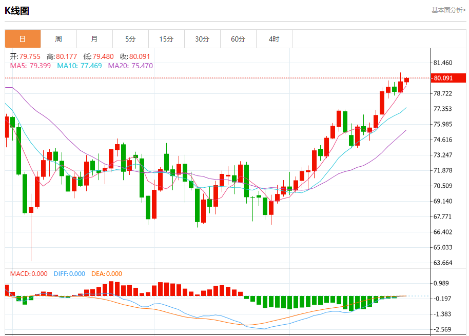 周五盘中,WTI原油报80.034,涨幅0.30%。