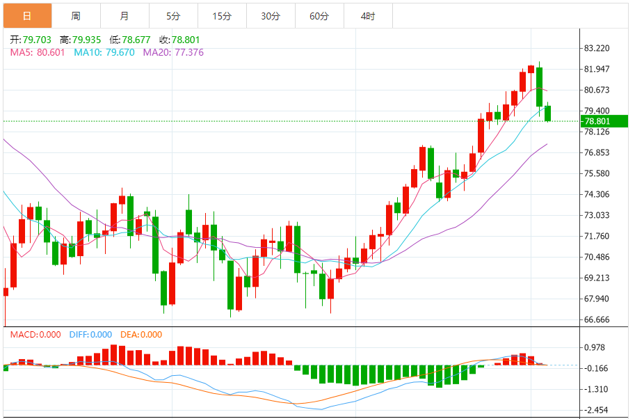 日线上看,NYMEX原油跌破79.13美元,后市或进一步下探78.11美元,它们分别是73.78美元-82.43美元上行区间的38.2%斐波那契回档位和50%斐波那契回档位。