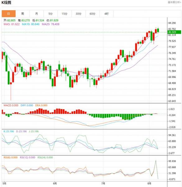 在上一个交易日,原油上涨趋势继续。上周,周线出现了五连阳,打破了区间的上轨,并加速上涨,周线收于均线上方,这种单边趋势将继续。日线图此前已进行了修正,以快速修正阴线回缩,连续出现阳线回升,并创下新高。4小时图进一步突破高点,此前回踩78.60形成第三浪的起动点,上周尾破高后在这个星期还将进一步,强势单边行情,积极跟进做多。强势不回调,回调不强势。