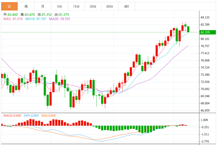 上方初步阻力在日内高点82.47附近,若能顶破该位置,则削弱短线看空信号;若能强势顶破83.51附近阻力,则需要提防空单被止损后的短线快速拉升行情,进一步阻力参考11月10日低点84.70附近位置,另外,在失守21日均线78.58前,油价中线仍有进一步冲高的机会。