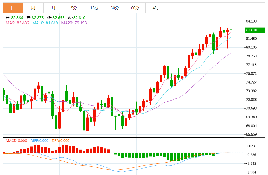日线级别:单边上涨受阻;油价在4月份高点附近录得接近“十字星”K线后,周二录得接近“上吊线”的K线,KDJ高位钝化,MACD顶背离后红色柱萎缩,仍需提防油价高位筑顶的可能性,下方初步支撑在5日均线82.48附近,10日均线支撑在81.64附近,若失守该支撑,则增加后市下行风险,进一步支撑参考80整数关口附近,隔夜低点支撑也在该位置附近,强支撑在21日均线79.03附近,若失守该支撑,则增加见顶信号。