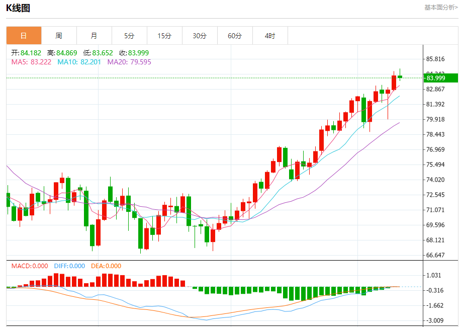 周四盘中,WTI原油报84.052,跌幅0.17%。