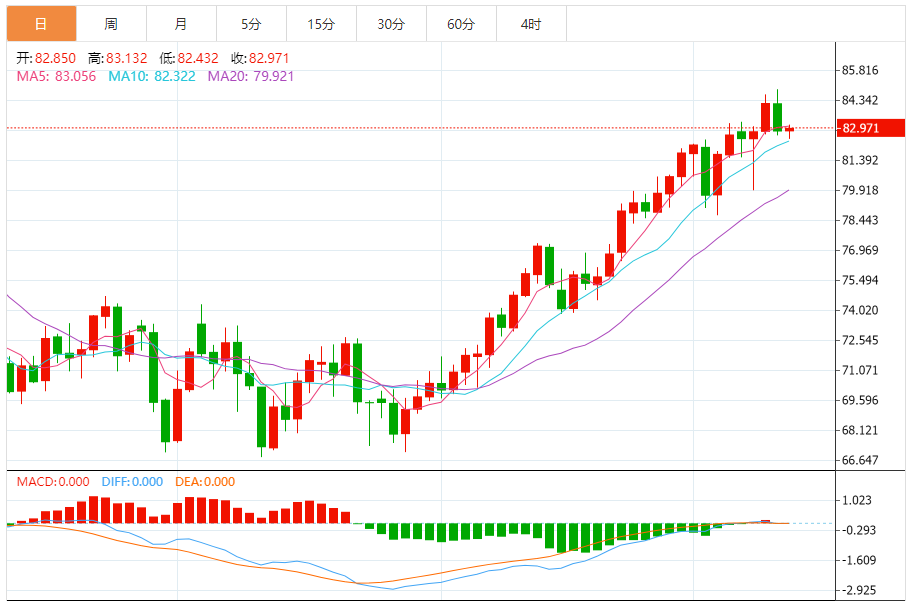 短线的话,初步支撑参考10日均线82.30附近,周一低点支撑在81.52附近,然后是80整数关口支撑,本周低点支撑也在该位置附近,上周低点支撑在78.68附近,如果回落至该位置下方,则增加后市看空信号。