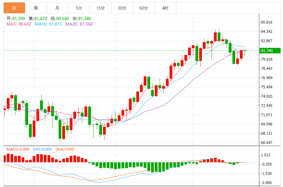 在收盘于10日均线上方前,后市略微偏向震荡下行,目前5日均线支撑在80.71附近,然后是80整数关口,上周低点支撑在78.93附近,若失守该支撑,则增加短线看空信号,进一步支撑参考7月13日高点77.31附近位置,200日均线支撑在76.13附近,强支撑参考100日均线75.24附近位置。