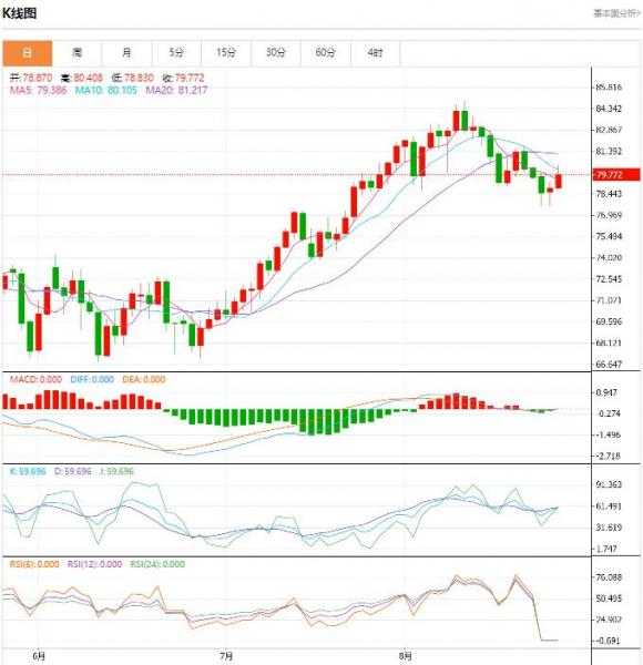 美原油市场昨日收盘走低,今日日线有看多技术需求,MACD死叉,不过KDJ接近超卖区域,并有金叉趋势,油价已连续两天在7月13日77.31的高点上方获得支撑,短线趋势变数加较大,未来市场重拾涨势的可能性增加。上方留意10日均线80.15附近阻力,如果能收复这个位置,则增加短线看涨信号。