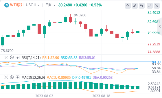 8月上旬,原油持续走高,最高触及84.32,为自7月下旬以来最长连涨时间,也攀升至接近年初的水平。市场预计美联储的货币紧缩行动尚未结束,应该会限制需求。此前由于沙特和俄罗斯的供应限制收紧了市场,原油价格在7月份上涨,但料8月将出现月度小幅下跌。Philip Nova Pte高级市场分析师普里扬卡萨赫德瓦表示:“沙特可能将减产措施延长至10月的预期,进一步支撑了油价。但在借贷成本上升的背景下,对宏观经济的担忧日益加剧,限制了油价的上行空间。”截至目前,原油徘徊在80.24附近。