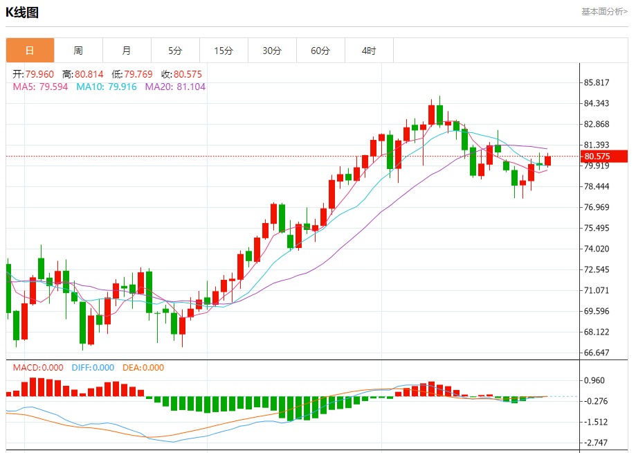 周二盘中,WTI原油报80.544,涨幅0.71%。