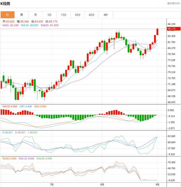 原油价格昨日强劲上涨,收盘走高符合预期;KDJ金叉,随着5日均线重新突破10日均线,油价初步突破布林线中轨,站在所有均线上方;4小时图此前在77.80形成底部反弹,周中依托中轨形成单边多头趋势,不过回踩空间有限,仍需谨慎。