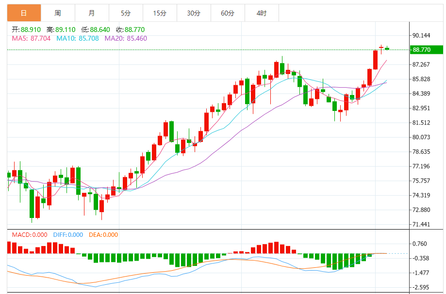 北京时间9月5日14:26,布伦特原油连续报88.92美元/桶。