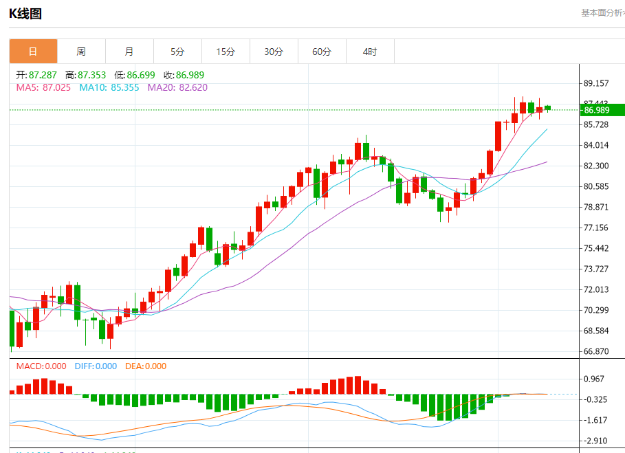 周一盘中,WTI原油报87.182,涨幅0.02%。