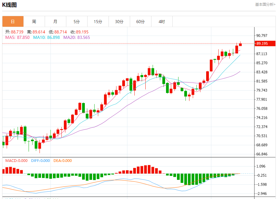 周三盘中,WTI原油报89.209,涨幅0.50%。