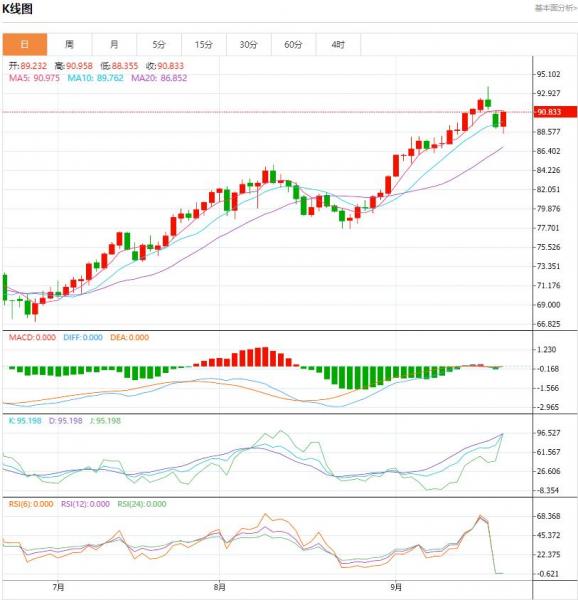 WTI原油在迈向93关口时出现了MACD背离现象,这预示着接下来最可能的情况是向下调整。