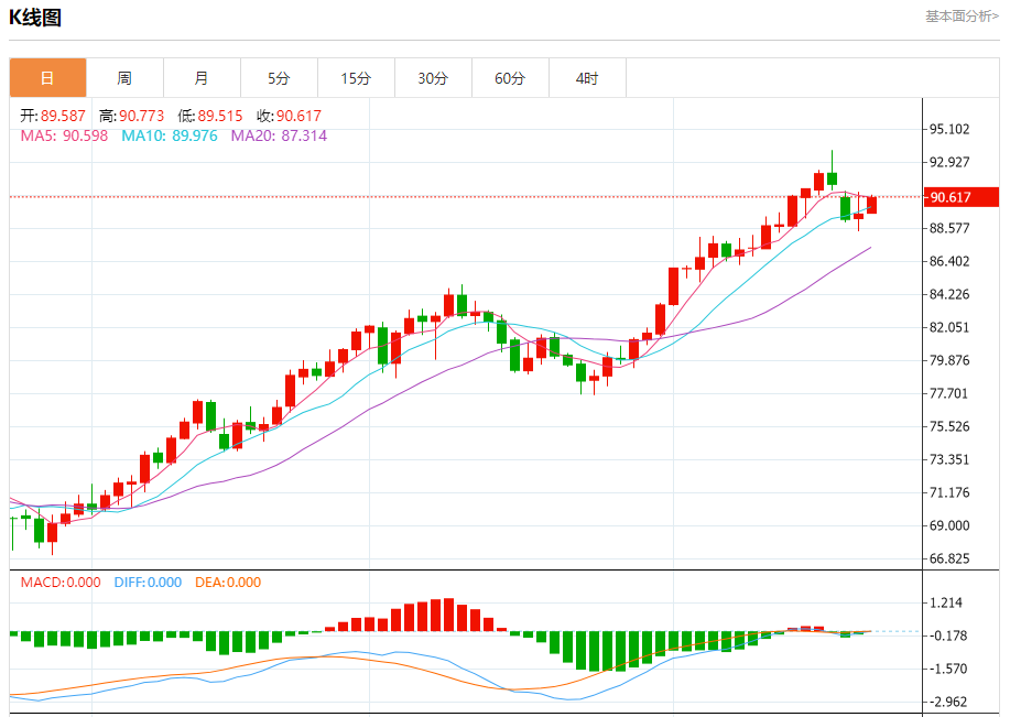 周五盘中,WTI原油报90.523,涨幅1.11%。