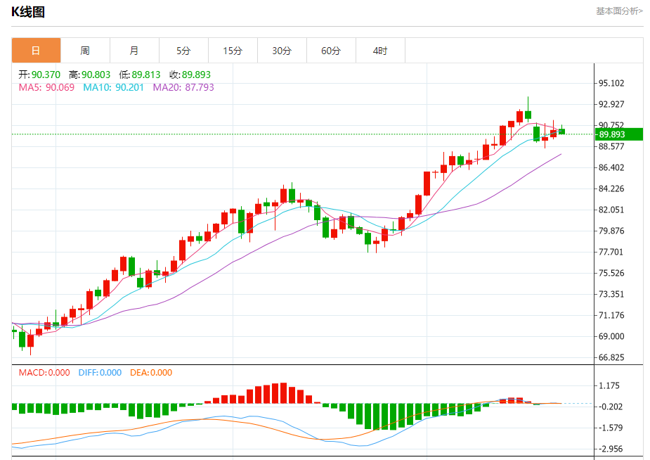 周一盘中,WTI原油报89.673,跌幅0.66%。