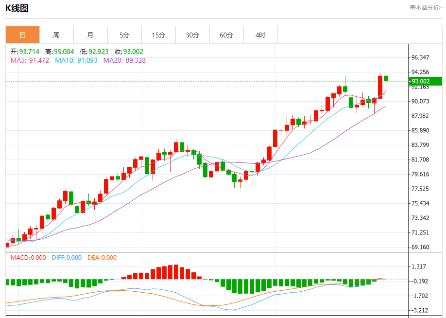 周四盘中,WTI原油报93.154,跌幅0.59%。