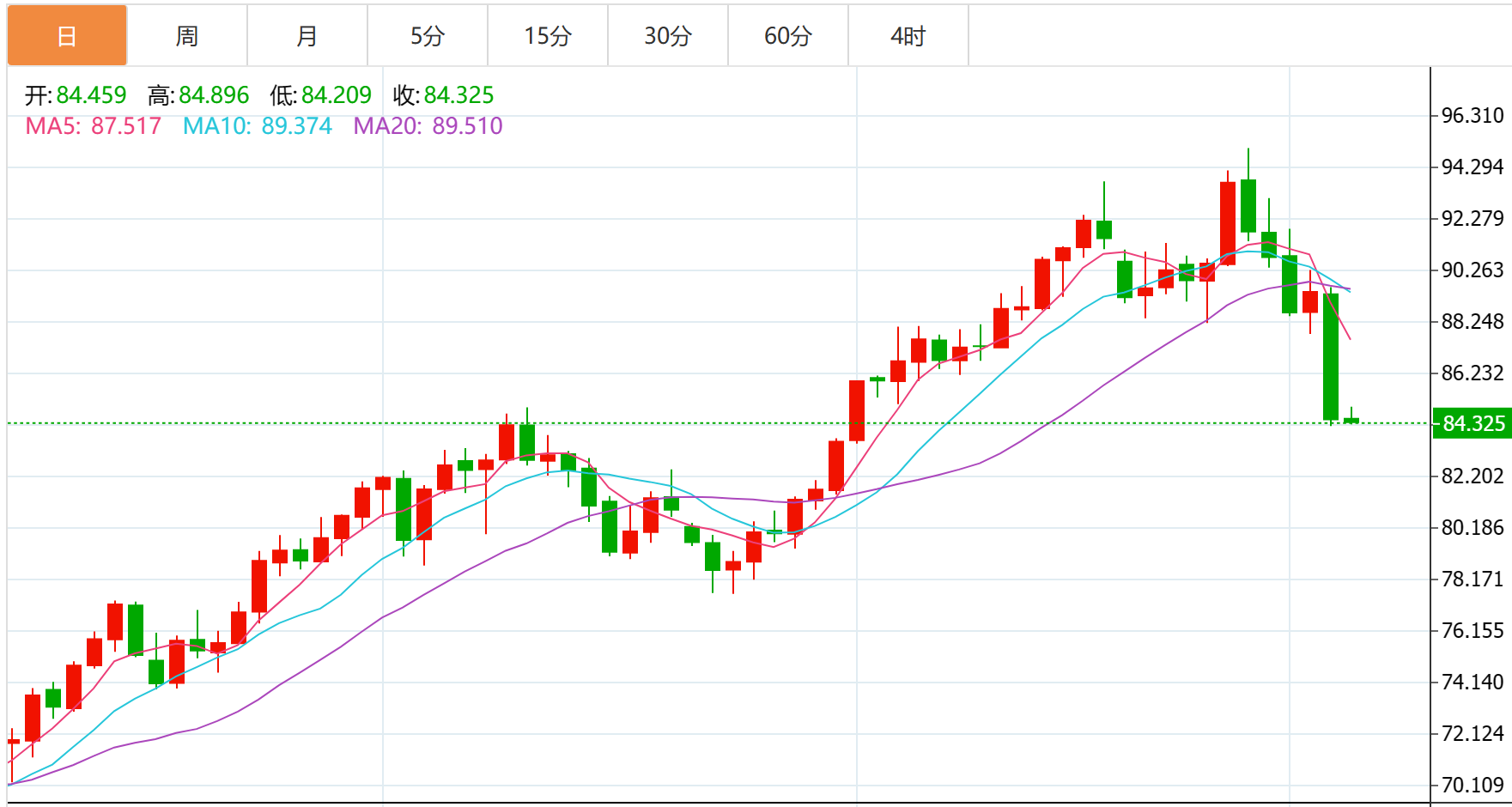 油价跌至一个多月来的最低点,周三的大幅下跌导致日线图上形成反转模式。新的疲软刺穿了关键的斐波那契支撑位84.31美元(67.02美元/95.00美元反弹的38.2%,周三的行动找到了暂时的足迹),这表明从95.00美元(2023年9月28日的顶部)开始的更大空头可能会恢复。