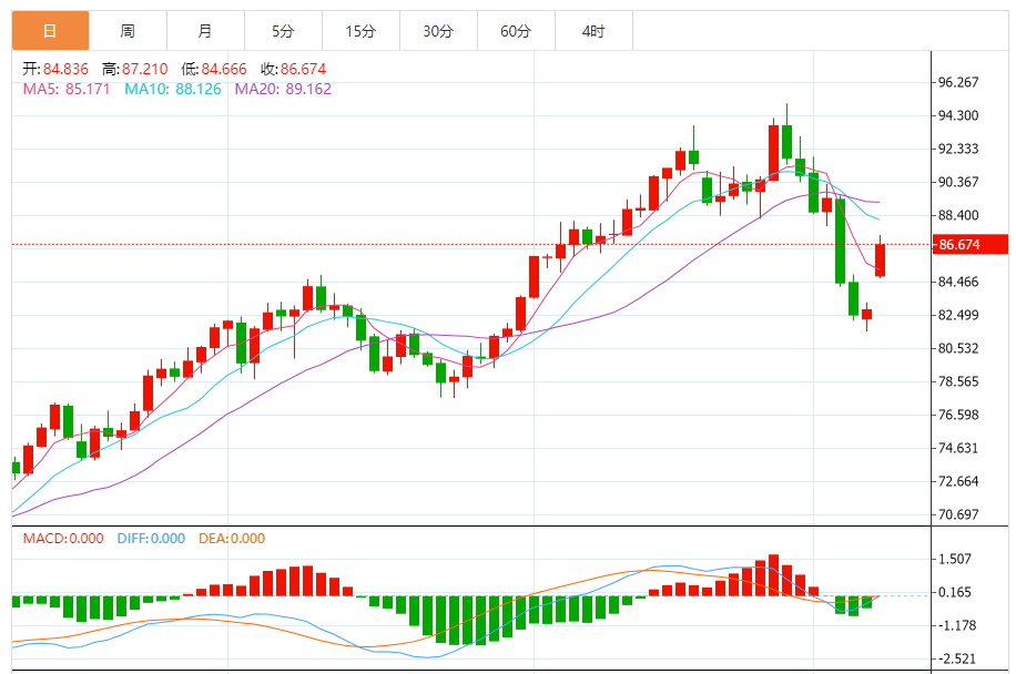 综合来看,原油日内操作思路上建议上方关注87.0-880一线阻力,下方短期关注84.0-83.0一线支撑。