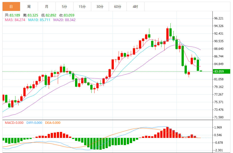 周四(10月12日),美原油价格交投于83.02美元/桶附近,跌幅为0.30%。