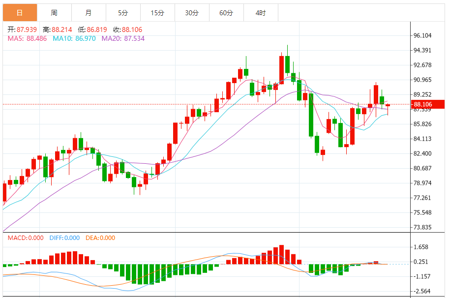 周一(10月23日),原油价格交投于88.085美元/桶附近,跌幅为0.10%。