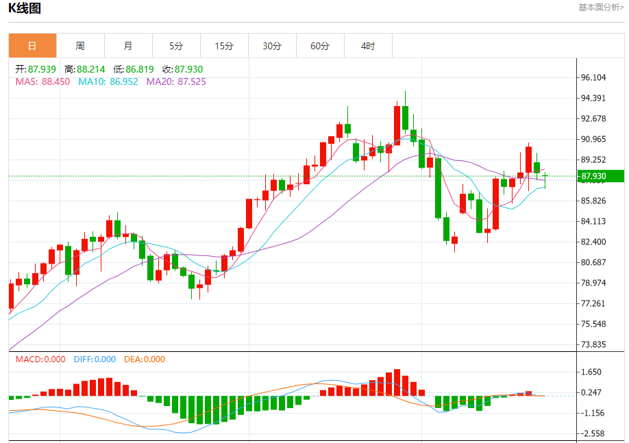 周一盘中,WTI原油报87.841,跌幅0.36%。