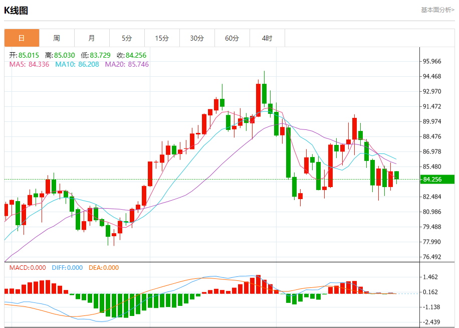 周一盘中,WTI原油报83.865,跌幅1.31%。