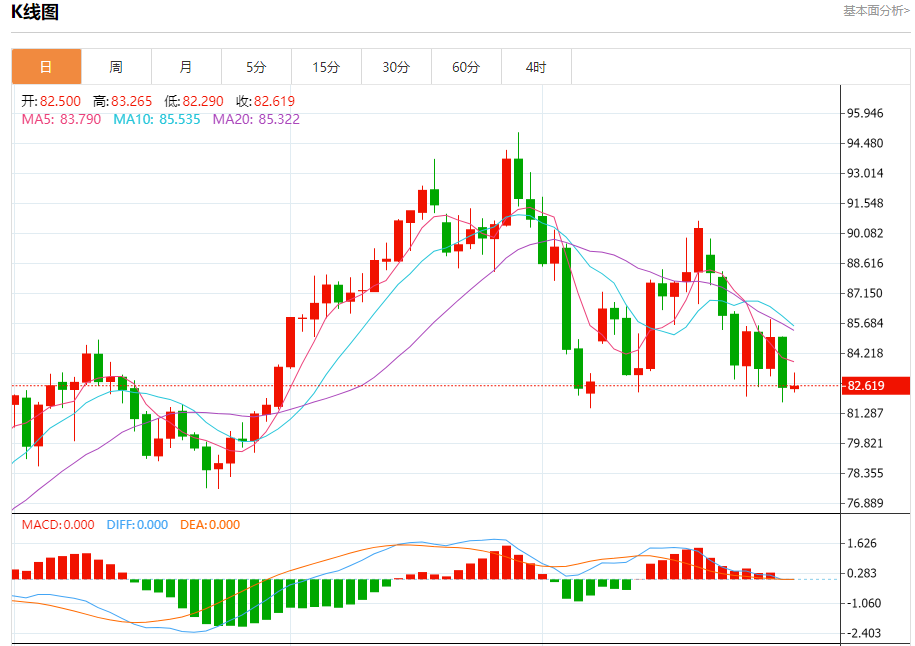 周二盘中,WTI原油报82.881,涨幅0.38%。