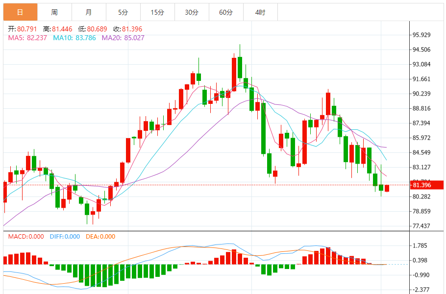 原油昨日震荡连阴回撤,长时间的横向整理,终究未能守住低点81.50走收复性上升,尾盘小幅度的破低收在低位,虽然空间没有完全释放出来,但4小时图结构小台阶震荡破低下行,关键的低点破位,短线回落浪形延续。日线伴随连阴回撤,打破了一阴阳的震荡格局。
