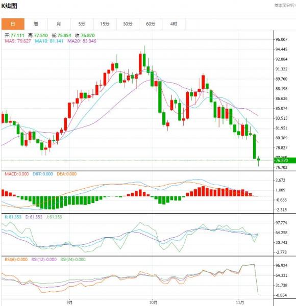昨天,原油直线下破,日线级别收录一根大阴线,高价没有打破之前的高点,而低价打破了之前的低点,呈现出落尾走势,后市延续看跌思路。在四小时的级别上,布林带开口向下拐头,均线系统高位死叉后向下发散中,上方多空分水岭在80.1美元,突破之后才能改变偏空格局。与此同时,短期阻力位关注78.6-79.5美元一线。