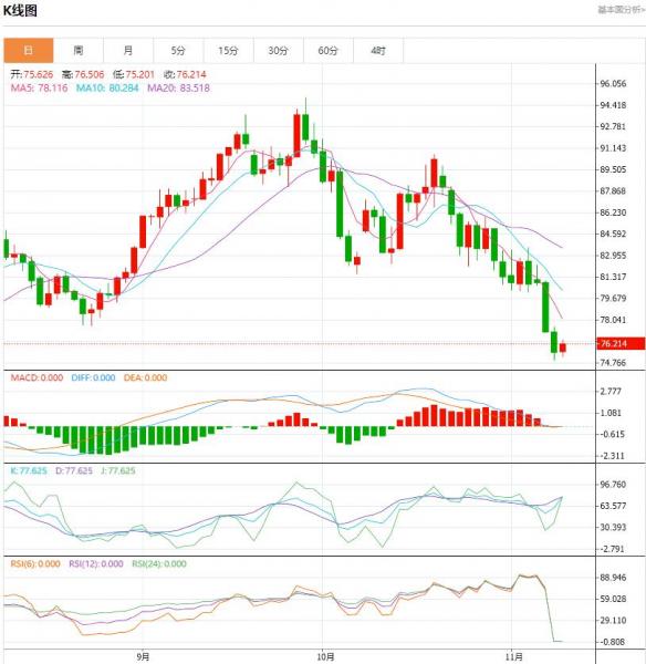 原油昨日收盘在75.530美元/桶,日线级别收录一根大阴线,虽然没有前一日的幅度大,但形态仍是很弱,后市延续看空情绪。四小时级别上看,原油在下破80.1颈线位之后,油价空头出现加速阶段,空头有进一步下探的可能性,上方阻力位关注76.9美元一线,多空分水岭在78.4美元。