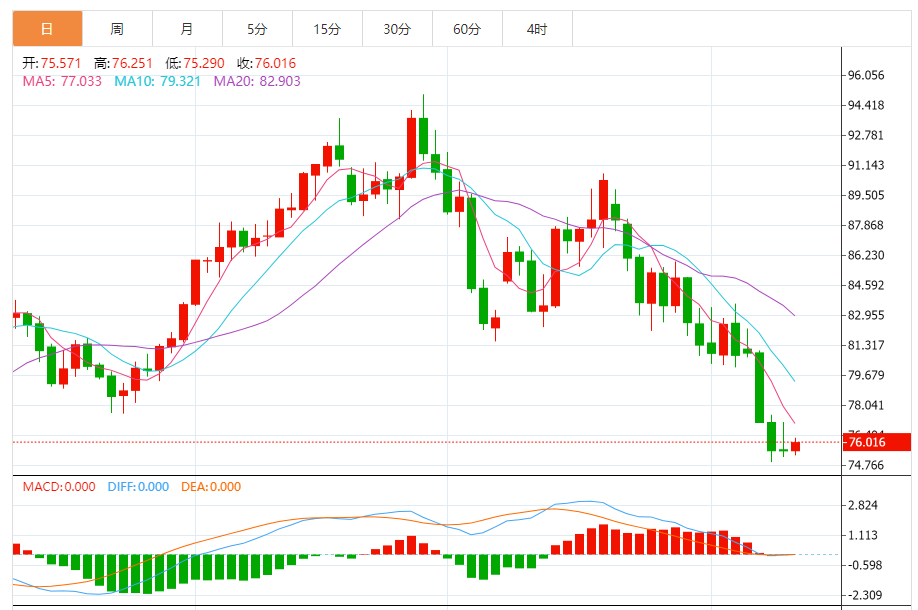 今天的预期交易区间:在75.00支撑和78.00阻力之间。