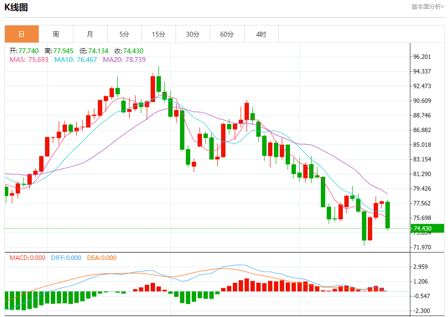 周三盘中,WTI原油报74.696,跌幅3.99%。