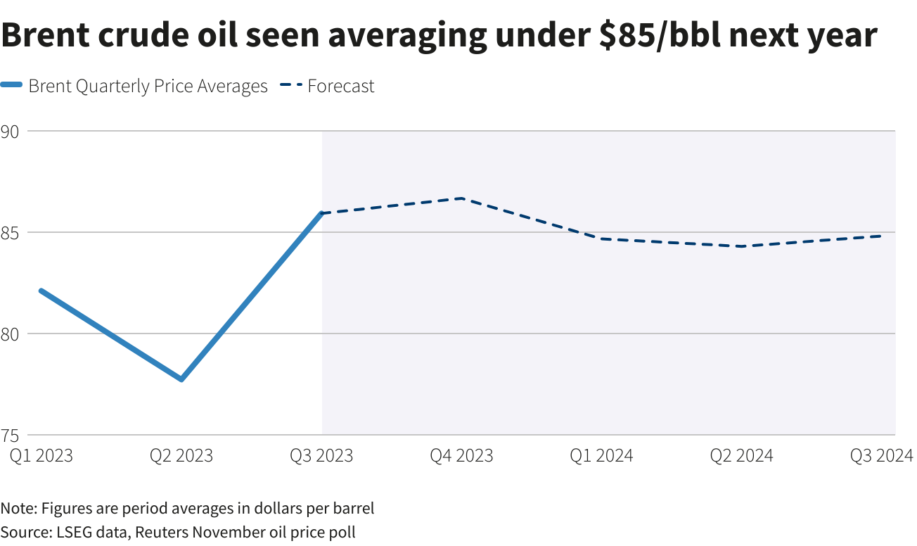 一项对30位经济学家和分析师的调查预测,到2024年,布伦特原油的平均价格可能为84.43美元。