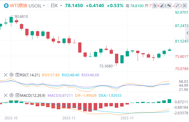 11月,原油开盘后下跌,最低跌至72.36后反弹,近期巴以冲突协议停火,国际舆论关注度降低,近期红海发生一系列商船袭击事件,美国对船只运营商发出警惕提示,需关注地缘斗争外溢带来的航运波动风险。OPEC+会议临近,但配额争端尚未解决,市场一度忧虑会议再度推迟,据最新报道将于周四如期举行。截至发稿,原油徘徊在78.15附近。