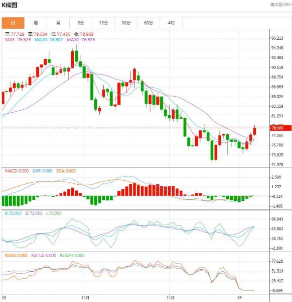 WTI 1月原油期货周三收涨1.45美元/桶,涨幅将近1.90%,收报77.86美元/桶,盘中曾刷新一周高点至78.07美元/桶,也正好是200日均线阻力所在。