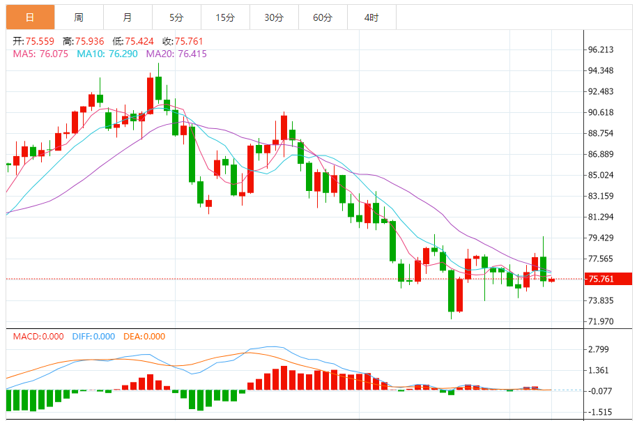 原油昨日低位整理回升收阳,连续的横向整理依旧守住了低点72.30上方运行,日线继续震荡当中,目前只是局部反弹修正,暂时还看不出单边强弱的方向。只是短线迂回反复。