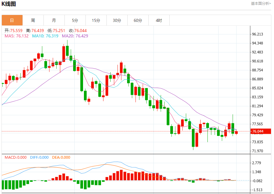 技术点评:只要76.55阻力位不被突破,向下跌破75.05位置的风险很高。
