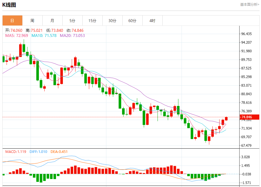 周三盘中,WTI原油报74.860,涨幅0.95%。
