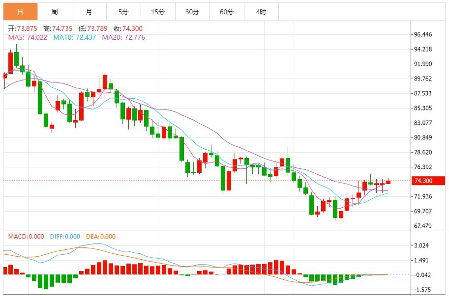 原油昨日先抑后扬,日线收盘小阳十字星K线,K线实体依旧较小,在整理中蓄势,日线还是保持向上态势,只是短线由低位反弹开始转换为反转当中,伴随整理回踩蓄势,昨日回踩依旧启稳在72.50之上,小周期次低点的防守。