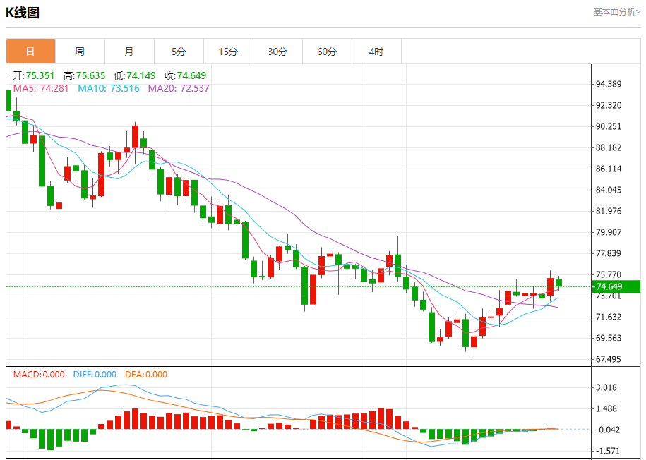 周三盘中,WTI原油报74.901,跌幅0.69%。