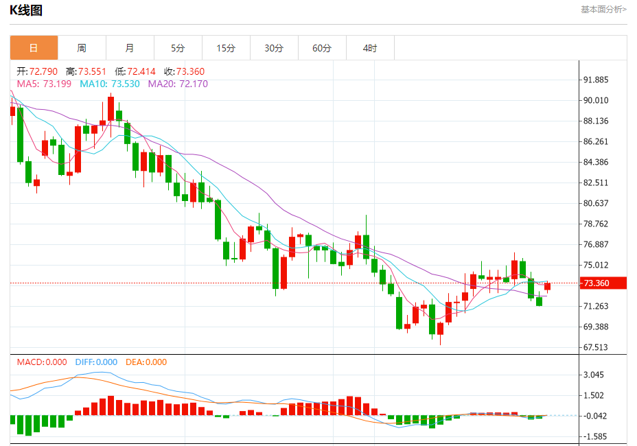 周二盘中,WTI原油报73.359,涨幅2.80%。