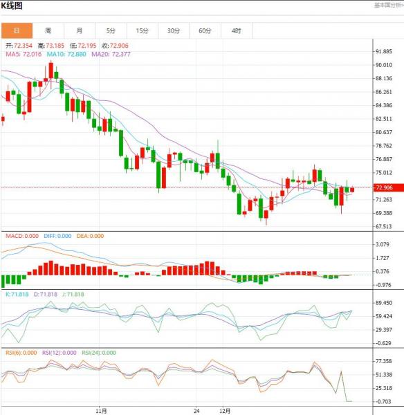 原油周四先涨后跌,呈震荡下行,日线收阴于72.3,从日线看油价还将处于大区间运行,四小时线,布林轨平行,呈区间震荡。短期上方均线的压制仍是短期重点关注的位置。